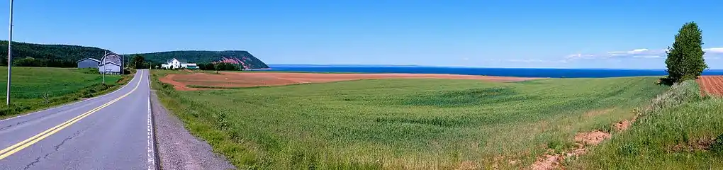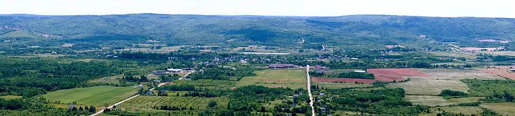 The steep face of basaltic North Mountain shelters the valley from the adjacent Bay of Fundy and rises over 260 metres (850 ft) in elevation near Lawrencetown.[2] The granitic South Mountain rises to a somewhat higher elevation and shelters the valley from the climate of the Atlantic Ocean approximately 100 kilometres further south on the province's South Shore.