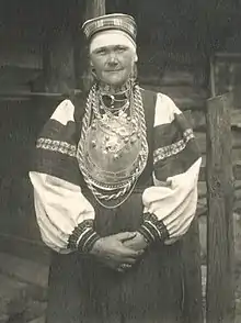 Anne Vabarna (21 December 1877 in Võpolsova – 7 December 1964 in Tonja) was a Seto singer.[1] In her lifetime she recorded over 140,000 verses, most notably her composition of the Seto national epic 'Peko', depicting the tale of the Seto hero who provides freedom for the Seto people. Her repertoire also includes songs of traditional Seto lyric and lyric-epic types, children's songs, prayers, fifty two bridal laments, improvisations (dedicated to collectors of folklore, statesmen, doctors, guests-all in all over 20,000 verses), epic compositions and folk tales.
