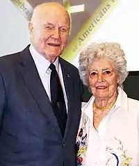 Castor met John Glenn at a very young age when her parents became involved in the same community organizations as Glenn's parents.[4] The families developed a friendship which allowed Castor and Glenn to remain close as they grew up.[4] The pair became high school sweethearts and continued dating through college.[4] Castor attended Muskingum College where she majored in music with a minor in secretarial skills and physical education.[4] Castor was an active member of the swim team, volleyball team, and tennis team.[4] She graduated in 1942.[1] Even though she received an offer for a pipe organ scholarship from the Juilliard School, Castor declined the offer,[5] choosing instead to stay in Ohio with Glenn. Castor and Glenn were married on April 6, 1943.[1] They had two children, David, born in 1945, and Lyn, born in 1947.[6]