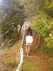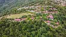 At an altitude of 1,100 meters and on the highest edge of the village, an artificial environmental settlement has been built by the local forestry authority with funding from the Ministry of Agricultural Development. It is known as dasiko horio (literally translating to forest village) by the locals. Its construction was part of the Ministry's broader effort to create infrastructure in remote mountainous forest regions of Greece, to facilitate short-term visitor stay in relative comfort close to the forest, for recreational and educational purposes.[47] It consists of 20 wooden residences that are spread on an area of 29 acres and can accommodate up to 80 guests.[48]