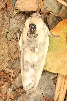 The wingspan is 21–30 mm. Adults resemble a bird-dropping.