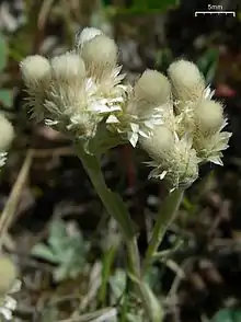 Antennaria parvifolia generally grows a few centimeters high but it may reach 15 centimeters. The grayish, woolly-haired leaves are up to 3.5 centimeters long, the upper ones shorter and narrower than the basal. The inflorescence contains 2 to 7 flower heads. The plant may be gynoecious, containing only female flowers, or dioecious, with some female plants and some male in a given population. Dioecious plants are most common in Colorado and New Mexico,[2] and can reproduce sexually, though male plants are much less common than female.[5] Plants in most other areas are mostly gynoecious, reproducing asexually via apomixis.[2] The plant forms mats by spreading stolons and sprouting new stems.[5] The flower heads are lined with an outer layer of phyllaries which are variable in color from white to red, green, or brown.[2] The fruit is an achene with a pappus that helps it disperse on the wind.[2]