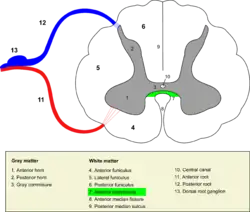The anterior white commissure (ventral white commissure) is a bundle of nerve fibers which cross the midline of the spinal cord just anterior (in front of) to the gray commissure (Rexed lamina X). A delta fibers (Aδ fibers) and C fibers carrying pain sensation in the spinothalamic tract contribute to this commissure, as do fibers of the anterior corticospinal tract, which carry motor signals from the primary motor cortex.