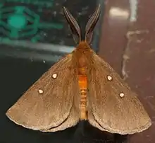 Adults are brown with two white spots outlined in dark brown on each forewing, and one or two on each hindwing. The abdomen is partly orange.[2]