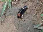 The larva has a flattened form, a large head capsule, and prominent mandibles.[1]