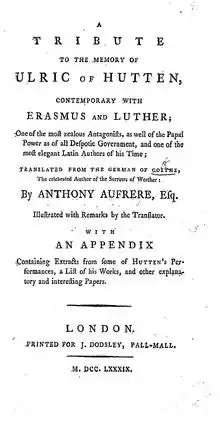 - A Tribute to the Memory of Ulric of Hutten, contemporary with Erasmus and Luther;One of the most zealous Antagonists, as well of the Papal Power as of all Despotic Government, and one of the most elegant Latin Authors of his Time; Translated from the German of Goethe, The celebrated author of the Sorrows of Werther : By Anthony Aufrère, Esq. Illustrated with remarks by the translator. With an appendix containing extracts from some of Hutten's performances, a list of his works, and other explanatory and interesting papers. London. Printed For J. Dodsley, Pall-Mall. (1789), in fact an English translation of the 1776 written essay by Johann Gottfried Herder.