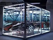 James gained international recognition in 2008 for his work Kalos Thanatos (KΘ), Greek for “beautiful death”, when he burned his Ferrari F335 Spyder in a birch forest, and then displayed it in a mirrored glass box with birch tree trunks. James was inspired by the ancient Greeks, who made sacrifices to Aphrodite in birch forests.[1] Glenn O'Brien lauded James's Kalos Thanatos: "I miss art going out on a limb ... Just a slim limb that looks like there’s at least some chance of it snapping ... Anthony James burned his Ferrari and put it in a box, amid, actually, a bunch of limbs. That was going for it ... this work is pretty gutsy".[2]