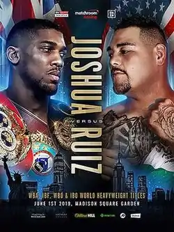 Anthony Joshua vs. Andy Ruiz Jr. was a heavyweight professional boxing match contested between undefeated and unified WBA (Super), IBF, WBO, and IBO champion Anthony Joshua, and former world title challenger Andy Ruiz Jr. The bout took place on June 1, 2019 at Madison Square Garden in New York City, New York. Joshua was originally scheduled to face undefeated WBA No. 2 and WBO No. 3 ranked heavyweight Jarrell Miller, who was replaced by Ruiz Jr. after Miller failed three drug tests.[1] He was replaced by Ruiz, who was the WBA No. 5, WBO No. 11 and IBF No. 14 ranked heavyweight.