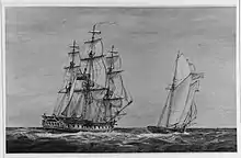 Maitland was promoted to post-captain on 25 September of the same year, but his next command was not until 1 August 1811 when he was appointed to the frigate HMS Pique at Woolwich.[1][5] His command of Pique resulted in some wide-ranging travel, including service on the Downs, Lisbon, South America, and Jamaica Stations.[1] Maitland and Pique sailed for the Leeward Islands on 7 June 1812 to participate in the War of 1812.[3] In August 1813 Maitland had Pique off the east coast of America; he successfully chased and captured the 5-gun American privateer Hawk which surrendered without a fight.[4][6] On 13 and 19 January 1814 Pique took respectively the Swedish ships Bernat and Margaret and sent them in to Guadeloupe.[5] Maitland and Pique sailed for Portsmouth at the end of 1814, but returned to the West Indies in the spring of 1815.[5]