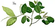 The taxa can grow as a shrub or a small tree, from 2m up to 20m high,[4] in Australia often with a short, poorly-formed trunk/bole.[5] Dark-coloured bark. Leaves are some 3-7 by 3–5 cm in size (sometimes as short as 2 cm or as long as 16 cm, as narrow as 2 cm and as wide as 9 cm), with curving lateral veins (but these do not form distinct loops inside the margin), oblong blade (occasionally ovate or obovate); pale twig lenticels; pubescent, filiform stipules; tufts of hair/domatia present; leaves dry to olive-green to reddish-green. Its flowers emerge at the axils or on the tip of branches. Male flowers have 4–5 stamens with u-shaped anthers, while female flowers have ovaries covered with soft hairs.[6] Yellow-green flowers,[7] some 1mm in diameter with pubescent disc, these are for both male and female flowers. Small fruit, only 4-5mm long with a persistent calyx that is not disc-like. Seed germination occurs in 28–9 days. There are elliptic cotyledons, some 8 by 5mm. At tenth leaf stage there are hairy petioles and hairy, filiform stipules (1-2mm long). In Western Australia, flowering occurs from August to December.[7] In Thailand, flowering and fruiting is all year round.[8] In Zhōngguó/China, flowering is from March to September, while fruiting is from June to December.