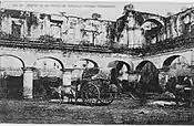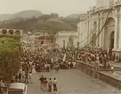 After the Santa Marta Earthquakes of 1773 that destroyed Santiago de los Caballeros de Guatemala, there was a large argument between Spanish and clerical authorities on whether to move the city to a new location . Against strong opposition of archbishop Pedro Cortés y Larraz, Captain General Martin de Mayorga decided to impose the move to its new location in the Ermita Valley; Cortés y Larraz was afraid that with the move the church had to begin from scratch and would lose part, if not all, of its power and influence.[2] The cathedral moved to the new capital on 22 November 1779, but all the interior ornaments that had not been destroyed by the earthquake in the old building remained behind in what was now called Antigua Guatemala; in 1783 they were taken away from the frail ruins and stored in the old Universidad de San Carlos Borromeo building and in the El Sagrario Parish warehouse, which was also open the public in a section of the old cathedral.[2]