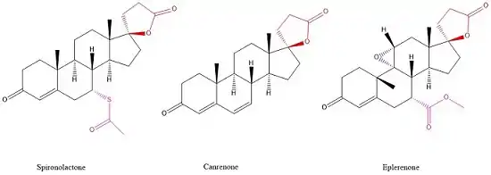 Spironolactone and Eplerenone competitively block the binding of aldosterone to the mineralocorticoid receptor and hindering the reabsorption of sodium and chloride ions. The activity of mineralocorticoid antagonists is dependent on the presence of a y-lactone ring on the C-17 position. The C-7 position is also important for activity as substituents there sterically hinder the interaction of C-7-unsubstituted agonists such as aldosterone.[7]