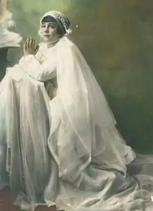 At first she dictated letters to her mother; later she wrote poems and letters herself and left each at the foot of her crucifix. In another letter she wrote: "Dear Jesus, I love you very much. I want to abandon myself in your hands. I want to abandon myself in your arms. Do with me what you want. Help me with your grace. You help me, since without your grace, I am nothing."[3] She wrote or dictated more than 100 letters to Jesus or to the Virgin Mary, describing "holy visions" in many of them.[4] After Mass, people sometimes saw her approach the tabernacle and say, "Jesus, come and play with me!"