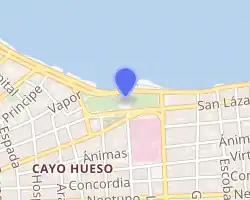 La Casa de Beneficencia, the hotel Manhattan on Calles Belascoáin and San Lazaro, by the U.S. Engineering firm of Purdy and Henderson, and the Hotel Vista Alegre also at the beginning of Calle Belascoáin, anchored a geographically important corner close to the sea of the large expanse of land known as El Barrio San Lazaro and within it and immediately to the north was the Caleta de San Lazaro.[2] Cayo Hueso was also a part of El Barrio de San Lazaro. Cayo Hueso ("bone cay"), its name derives from its location near the Espada Cemetery.[3] it was demolished in 1908. Among the oldest institutions in the area were the leprosy hospital (demolished in 1916), the Casa de Beneficencia orphanage (currently the Hermanos Ameijeiras hospital).[4] Buildings in the Barrio San Lazaro that were important to the early development of the city were the Hospital de San Dionisio for the mentally insane, the Cementerio General known as the Campo Santo and more commonly referred to as the Espada Cemetery was the precursor to the Colon Cemetery, and a room for the treatment of the mentally ill located on the side of the Real Casa de Beneficencia on Calle Belascoáin. The monument to Antonio Maceo was located near a place previously occupied by the Batería de la Reina, (1861), located in front of the La Casa de Beneficencia y Maternidad, at the intersection of Belascoaín and San Lázaro. In 1916 the monument was placed but the park was not built, many voices were raised in a protest demanding that a greater tribute be paid to the figure of Antonio Maceo.