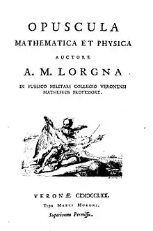 Returned to Venice in 1759, Lorgna became a student at the University of Padua; he didn't graduate, but learned physics, astronomy and mathematics under Giovanni Poleni and Giovanni Alberto Colombo.[1] In 1762 he enrolled in the Venetian army and went to Croatia for some time, then was appointed professor of mathematics in the military academy for engineers in Castelvecchio in Verona.[2] Lorgna worked at the Military College of Castelvecchio for the rest of his career, teaching courses on trigonometry, mechanics, statics for construction, ballistics and hydraulics. From 1784 he was also the general governor of the college, attaining the military rank of Brigadier.