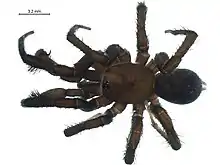 Antrodiaetus pacificus is a species of mygalomorph spiders native to the Pacific Northwest. Both male and female were first described by French arachnologist Eugène Louis Simon in 1884 under the name Brachybothrium pacificum.[1] The genus name is a combination of the Greek "antrodiaitos" (αντροδιαιτος), meaning "living in caves", "antron" (αντρον), meaning "cave", and "diaita (διαιτα), meaning "way of life, dwelling".[2] The specific epithet refers to its geographical distribution along the pacific coast of North America, between San Francisco Bay and Alaska. It is the northernmost mygalomorph spider in North America.[3]