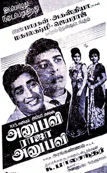 Anubavi Raja Anubavi (transl. Experience it boy, experience it) is a 1967 Indian Tamil-language comedy film written and directed by K. Balachander. It stars Nagesh along with R. Muthuraman, Rajasree and Jayabharathi. The film was remade in Hindi as Do Phool (1973),[2] in Malayalam as Aanandham Paramaanandham (1977), in Kannada as Kittu Puttu (1977) and in Marathi as Changu Mangu (1990).[3]