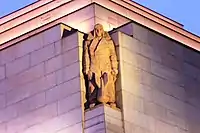 Hoff gave considerable prominence to the female contributors to the war effort in the ANZAC Memorial, including the women who lost their fathers, husbands and sons. Nurses were prominent among the figures representing the services and women were central to the group sculpture, "Sacrifice". Hoff explained the prominent position of the women in this work in 1932: "Thousands of women, although not directly engaged in war activities lost all that was dearest to them. There was no acknowledgment of them in casualty lists, lists of wounded, maimed and killed. In this spirit I have shown them carrying their load, the sacrifice of their menfolk".[10][2]