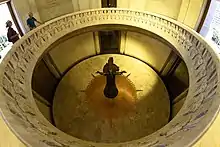 Similarly, while the central sculpture "Sacrifice" at the heart of the building is Hoff's, the form of the interior, itself very emotive, is Dellit's. Dellit used impressive staircases flanked by memorial urns to lead the visitor up into the Hall of Memory. Once there, they must bow their heads to look into the Well of Contemplation in order to contemplate "Sacrifice", which is in the Hall of Silence below or look up to see the dome decorated with 120,000 golden "Stars of Memory", each representing a serviceman or woman from NSW. Dellit's architecture and Hoff's sculptures greatly enhance each other to provide an artistically integrated emotional message.[10][2]