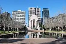Another feature that was considerably altered was the landscaping. Dellit planned water gardens for either side of the memorial in the form of a narrow pool to the north and a cascading waterfall to the south. However, as the bulk of the building began to rise above the park, it became apparent that the scale of the water features needed to be increased to balance it. As a result, the cascades were eliminated and the pool extended to 170 feet (52 metres) long by 72 feet (22 metres) wide. Landscaping was completed by the City Council, which was responsible for the park. Finance for the additional work came from the state Unemployment Relief Fund and a large number of council employees and relief labourers poured the concrete for the pool in a single day to eliminate the need for joints and ensure that it was watertight. The Council acceded to Dellit's request to keep a clear open space around the memorial. It also followed his plan for a line of poplars on either side of the pool to symbolise the French battlefields. Dellit also wanted beds filled with the red poppies of Flanders and other plantings from the eastern and western fronts.[10][2]