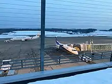 The runway was extended to 3,000 meters in 2005, and the instrument landing system upgraded to handle Cat-3a fog conditions in 2007.[5] The Tōhoku Shinkansen high-speed rail line was extended to Aomori in 2010, adding intense competition on the Aomori–Tokyo route.[6] The government of Aomori Prefecture considered the privatization of the airport in 2012 following a study; however, as of 2019 the airport is still managed by the prefecture.[7] After an increase in passenger traffic and the announcement of increased international services, the terminal was renovated in 2019. The renovation included increased capacity for international customers, the addition of prayer facilities for Muslims, and aesthetic updates to the appearance of the entire terminal building.[8]