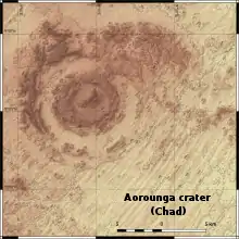 Aorounga is an eroded meteorite impact crater in Chad, Africa. The exposed remnant of the crater is 12.6 km (7.8 mi) in diameter and its age is estimated to be less than 345 million years (Carboniferous or younger).[1][2]