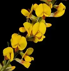 It is a slender upright shrub, growing to heights from 60 cm to 3 m, on peaty sand and sandy clays, in swamps and flats that are wet in the winter. The flowers are yellow and red brown, and seen from August to December.[4]