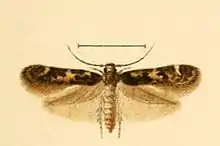The wingspan is about 9–10 mm. The ground colour of the forewings is yellowish, sprinkled with blackish-grey. The hindwings are grey.[2]