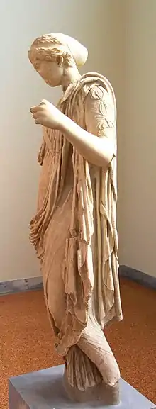 Pausanias recorded that three cult statues at Kythira, Sparta, and Corinth depicted Aphrodite as holding weapons and archeological evidence points to this portrayal also occurring in Argos.[1] Pausanias' claim that "Aphrodite Areia" was simply a female version of Ares has some support in the contemporary epigraphy.[1][7]