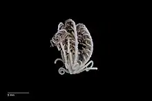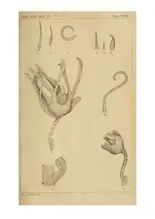 Plate XLVII shows three types of pinnules: first, second and distal pinnules (Figs 4-6), and pentacrinoid larvae (Figs 7-9) from youngest to oldest. Fig 10 shows a cirrus.[2] In the earliest free-swimming stage, the arms are about 7 mm long and have about nine pinnules on each side.[2] This is a small species of crinoid with arms up to 3 cm (1.2 in) long. All Clark's large specimens carried pentacrinoid larvae attached to their pinnules.[2]