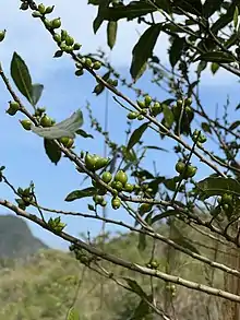The tree, sometimes shrub, which grows up to 15m tall, and up to 30cm in diameter.[8] In India the tree may grow some 9-12m tall, but is usually shrubby.[13] The bark is a light-brown to grey or tan, can be either smooth, roughened, thickened, flaky or with narrow vertical ridges and cracks.[8] Inner bark is pink. The wood is cream in colour. The branchlets usually have a few small scars of fallen leaves. The leaves are narrow, ovate to elliptic in shape, some 5-23.5 by 2-8cm in size, base is rounded to cuneate, obtuse in shape, the margins are lowly undulate to lowly glandular-crenate or -serrate and are sometimes slightly recurved; the apex of the leaves is acuminate to cuspitate; the leave are thinnish and smooth, not brittle and dull or slightly shiny; when dry they are grey-brown to green-brown above, greenish to brownish below. Inflorescences occur axillary or just below leaves. Staminate inflorescences occur as 1-5 cluster together, with 6-8 laxly set flowers, staminate flowers have 4 sepals and two stamens. Pistillate inflorescences occur as 1 to 3 clustered together, with up to 11 densely arranged flowers along the rachis, 4 sepals, occasionallyy staminodes, slightly raised and elongated stigmas, perpendicular to the sides of the ovary. The fruit are ovoid to ellipsoid in shape, rarely globose; slightly stiped and beaked young fruit are 9-13 x 6-10mm in size, punctate; they dry to dark brown/black, with sparse hairs. Terete, ellipsoid seeds (1 maybe 2 per fruit) are 7-8 x 5-6 x 3-4mm.
