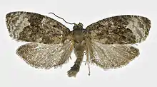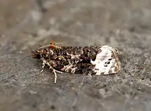 The wingspan is 17–22 mm. The forewings are white, sometimes ochreous - tinged, with some partly faint grey striae posteriorly. The basal patch, central fascia, and included space are brown mixed with dark ashy-fuscous and marked with black, slightly whitish-sprinkled, space more whitish towards costa. The posterior edge of fascia is slightly concave, in middle abruptly indented and there is a subapical group of several black dots. The hindwings are grey, darker posteriorly. The larva is greyish - green ; dots black ; head black.[1] Julius von Kennel provides a full description. [2]