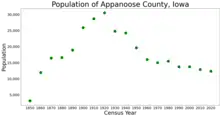 Appanoose County is a county in the U.S. state of Iowa. As of the 2020 census, the population was 12,317.[1] Its county seat is Centerville.[2]
