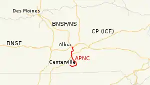 The Appanoose County Community Railroad (reporting mark APNC) was based out of Centerville, Iowa. It was a shortline running to the community of Albia, Iowa, where it distributed cars from Centerville to be put on the BNSF Railway's trains.