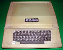 The first Apple II computers went on sale on June 10, 1977[2][3] with a MOS Technology 6502 (later Synertek)[17] microprocessor running at 1.023 MHz, 4 KB of RAM, an audio cassette interface for loading programs and storing data, and the Integer BASIC programming language built into the ROMs. The video controller displayed 40 columns by 24 lines of monochrome, upper-case-only (the original character set matches ASCII characters 0x20 to 0x5F) text on the screen, with NTSC composite video output suitable for display on a TV monitor, or on a regular TV set by way of a separate RF modulator. The original retail price of the computer was US$1298[18][19](with 4 KB of RAM) and US$2638 (with the maximum 48 KB of RAM). To reflect the computer's color graphics capability, the Apple logo on the casing was represented using rainbow stripes,[20] which remained a part of Apple's corporate logo until early 1998. The earliest Apple IIs were assembled in Silicon Valley, and later in Texas;[21] printed circuit boards were manufactured in Ireland and Singapore.