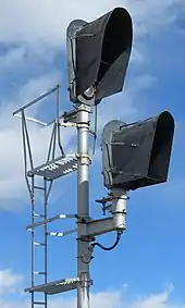 In 1954, the PRR experimented installing red lenses in the horizontal position of the upper head to help increase the at distance visibility of absolute Stop signals at Overbrook interlocking.[6] Under the Penn Central and later Conrail it became standard practice to add these red lenses to high position lights and even some pedestal signals. The Norfolk and Western modified its signals to use red and green lenses in the upper head Stop and Clear positions and yellow lenses everywhere else. In the 1980s Amtrak modified most of its former-PRR position lights to use the equivalent color light colors in all of the positions of both heads. Internally referred to as position color lights, these are not to be confused with color position lights described below, which while functionally similar are structurally considerably different.[5]