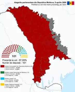 Following the elections, Parliament was required to elect a new President of Moldova as the incumbent Vladimir Voronin had to stand down after completing two terms.[1] Presidential elections required the winning candidate to receive at least 61 votes, but the opposition parties refused to vote for the three PCRM-nominated candidates in three rounds of voting between May and June 2009, meaning no president was elected. As a result, early parliamentary elections were held in July.