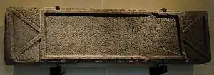 The earliest attestation of continuous Arabic text in an ancestor of the modern Arabic script are three lines of poetry by a man named Garm(')allāhe found in En Avdat, Israel, and dated to around 125 CE.[30] This is followed by the Namara inscription, an epitaph of the Lakhmid king Imru' al-Qays bar 'Amro, dating to 328 CE, found at Namaraa, Syria. From the 4th to the 6th centuries, the Nabataean script evolves into the Arabic script recognizable from the early Islamic era.[31] There are inscriptions in an undotted, 17-letter Arabic script dating to the 6th century CE, found at four locations in Syria (Zabad, Jabal 'Usays, Harran, Umm al-Jimaal). The oldest surviving papyrus in Arabic dates to 643 CE, and it uses dots to produce the modern 28-letter Arabic alphabet. The language of that papyrus and of the Qur'an are referred to by linguists as "Quranic Arabic", as distinct from its codification soon thereafter into "Classical Arabic".[3]
