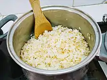 Arabic rice or rice with vermicelli (in Arabic, رز بالشعرية ruz bish-shaʿriah "rice with vermicelli"; in Turkish, şehriyeli pirinç pilavı) is a traditional preparation of rice in the Middle East, a variant of the simpler cooked rice recipe, but adding lightly toasted vermicelli (tiny noodles). The rice cooking method is known as pilaf,[1] by which the rice is fluffy, light and does not stick. Traditionally, a long-grain rice, such as basmati or jasmine, is used,[1] although short-grain rice, such as bomba or misri ("Egyptian"), can be used perfectly. Brown rice can also be used.[2]