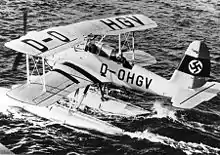 The Arado 95 was designed in 1935 as a two-seat seaplane, for coastal patrol, reconnaissance and light attack roles. The first prototype, an all-metal biplane powered by a BMW 132 radial engine, flew in 1936,[1] while a second prototype was powered by a Junkers Jumo 210 liquid-cooled engine. The two prototypes were evaluated against the similar Focke-Wulf Fw 62. The BMW-powered version was considered worthy of further study, and a batch of six was sent for further evaluation with the Legion Condor during the Spanish Civil War.[2]