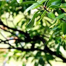 Araneus mitificus builds orb webs that are characteristically missing a section.[4] The spider does not rest on the center of the web, but instead builds a silk-lined sanctuary in a leaf at the margins.[1] The leaf is bent at the edges and roofed with a mesh of silk. If a prey animal becomes entangled in the web, the vibrations from its struggle travel to the center of the web, then along a single long strand of silk (the signal line) positioned in the empty section. The strand is linked to the hidden spider. Once the spider feels the signal line vibrate, it will rush out to capture the prey.[10][11]