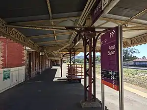 During 1985, the passenger facilities in the main station building were refurbished.[4] However, it was during this time that rationalisation of the facilities began; the "B" signal box was demolished in 1984, and the train control office followed in 1988. The former footbridge, which was located at the Up end of the station, was destroyed in a derailment in May 1986.[5] The former Mobil siding and associated points and staff lock were abolished in January 1988.[6] The locomotive depot closed in 1989, the train crew depot closed on 30 June 1994,[7] with "A" box following in 1996. Gauge conversion also occurred at the station in the 1990s, with the main line to Adelaide converted to standard gauge, as part of the One Nation project. The lines west and south were converted, with the line to Maryborough converted to dual gauge soon after.