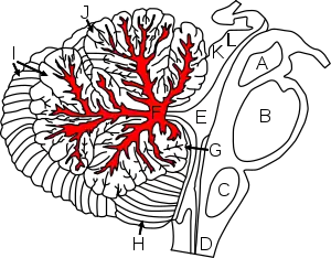 ![]() Figure shows cerebellum and surrounding regions; sagittal view of one hemisphere. A: Midbrain. B: Pons. C: Medulla. D: Spinal cord. E: Fourth ventricle. F: Arbor vitae. G: Flocculus. H: Tonsil. I: Posterior lobe. J: Anterior lobe. K: Inferior colliculus. L: Superior colliculus. | |