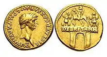 The Arch of Claudius was a triumphal arch in Rome built in honour of the emperor Claudius's successful invasion of Britain in AD 43. It was dedicated in AD 51 but had already been anticipated in commemorative coins minted in AD 46–47 and 49, which depicted it summounted by an equestrian statue between two trophies. However, the real structure was a conversion of one of the arches of the Aqua Virgo aqueduct at the point where it crossed the Via Flaminia, the main road to the north, just north of the Saepta.