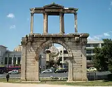 The Arch of Hadrian (Greek: Αψίδα του Αδριανού, romanized: Apsida tou Adrianou), most commonly known in Greek as Hadrian's Gate (Greek: Πύλη του Αδριανού, romanized: Pyli tou Adrianou), is a monumental gateway resembling—in some respects—a Roman triumphal arch. It spanned an ancient road from the center of Athens, Greece, to the complex of structures on the eastern side of the city that included the Temple of Olympian Zeus.