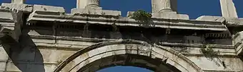 It has been proposed that there were statues positioned on top of the lower level, on either side of the central, aediculum-like, niche of the upper level, as was common for this architectural form; Theseus and Hadrian are the most commonly advanced candidates for these two statues, based on the inscriptions.[6] Ward-Perkins has proposed that the attic held additional multiple statues, located over the projecting Corinthian columns of the lower level. In stark opposition to these proposals, Willers states that there is no evidence of the type of doweling needed to mount statuary on the top of the lower level and that the stone is far too roughly worked on the upper surface for statues to rest on it.[7] Although Willers has done an excellent study of the lower level of the arch, permission was not granted for close study of the upper level, so his statements concerning the upper level are based on previously published measurements and images. Kouremenos suggests that in Hadrian's time the arch contained painted reliefs, possibly with statues in the central opening, that were taken down and replaced at some point in the Byzantine period.[8] A complete investigation of the monument remains to be done.