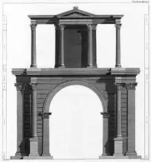 The single arched passageway of the lower level is 6.5m wide and was supported by pilasters crowned with Corinthian capitals. Similar, but taller, pilasters flank the outer corners of the lower level. The space between the outer pilasters and the arched opening was filled in with squared stones with drafted edges to emphasize the design.[3] On either side of the central passageway was a Corinthian column on a rectangular, raised base projecting from the center of the wall. The lower level was crowned with an Ionic architrave capped with dentils and a projecting geison.