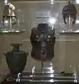 Hoplite armour exhibit. Note the gold inserts around the chest area of the bronze upper torso plate at the centre of the exhibit. The helmet on the upper left is a restored version of the oxidised helmet on the right.