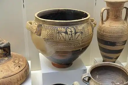 The museum's display of fine black-burnished ware is from the Late Neolithic period. It is decorated with a "ghost" of white paint giving the impression of a negative on the black surface. Pottery with a dark-on-light pattern painted with dull manganese-based paint is also presented from this period.[2]