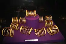 The golden bracelets, weighing between 800 and 1200 grams each, were discovered by looters in the Sarmisegetusa Regia Dacian fortress (UNESCO World Heritage site) in the Orăștie Mountains and they were illegally exported. They were recovered by the Romanian authorities from the international market through a collaboration with the German authorities.[5]
